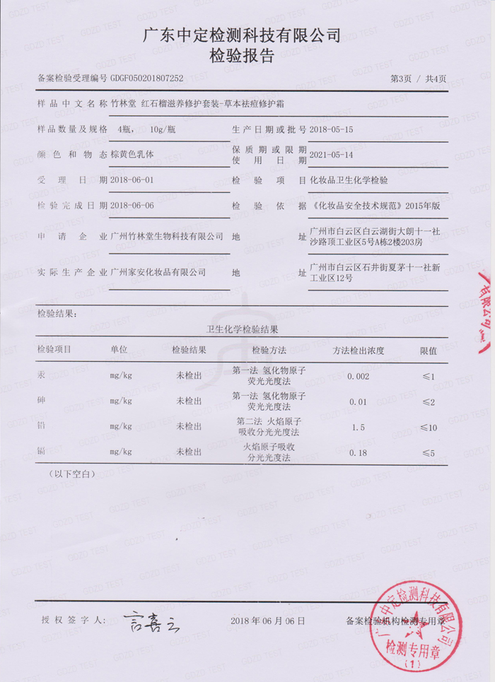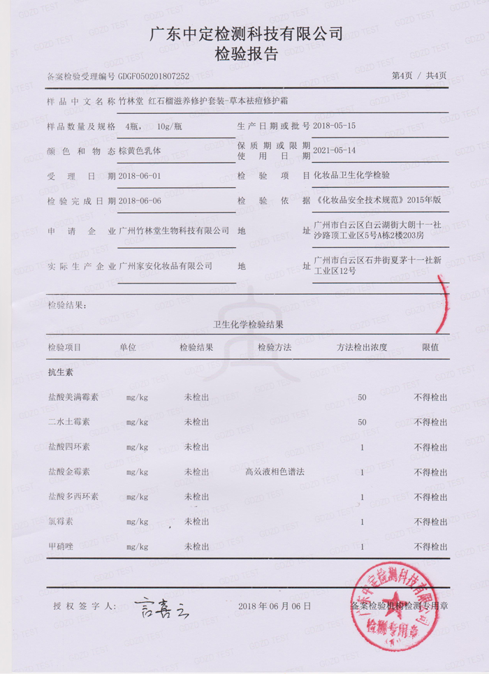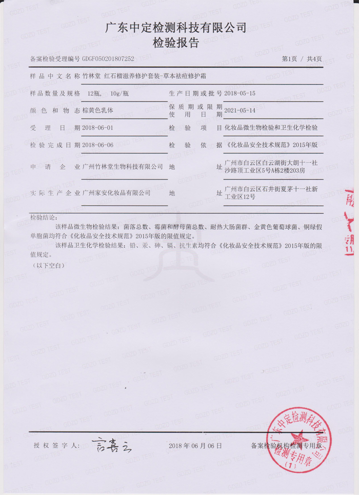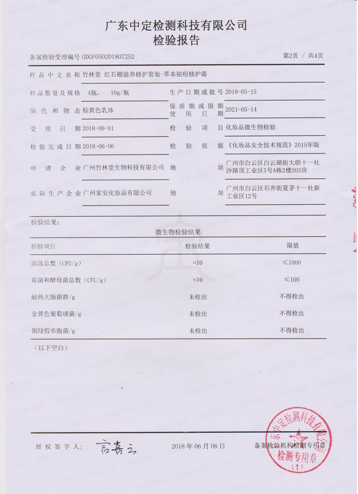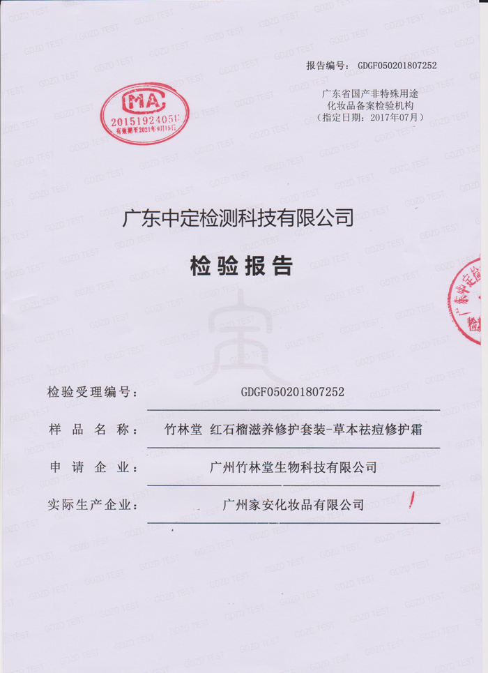 竹林堂红石榴滋养修护套装-草本祛痘修护霜检测报告