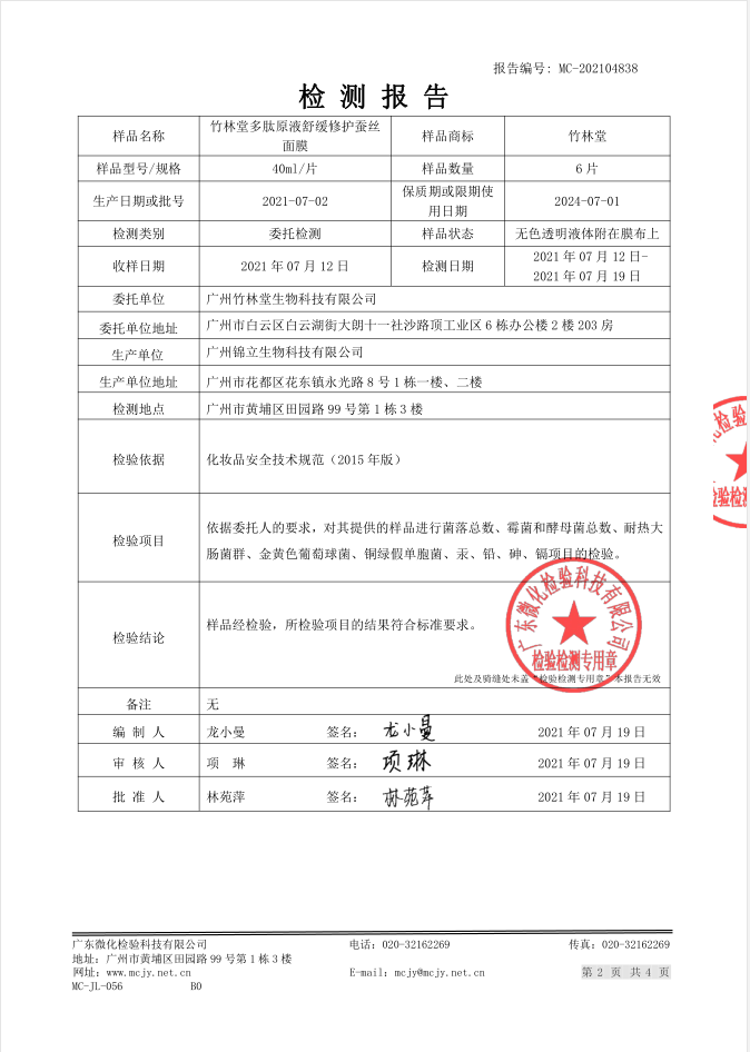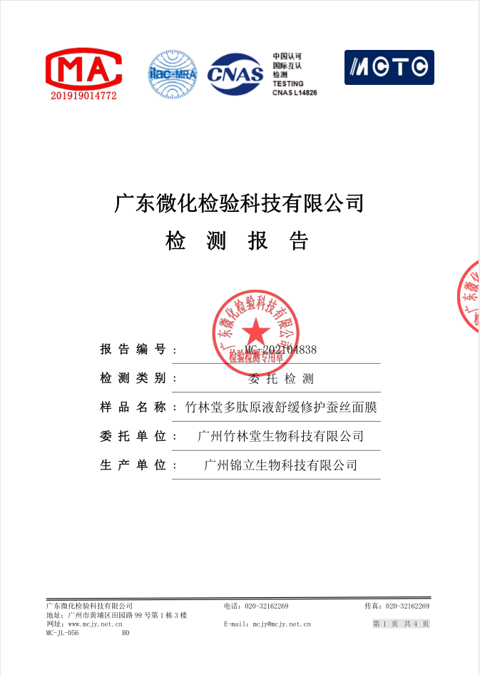 [国检报告]竹林堂多肽原液舒缓修护蚕丝面膜